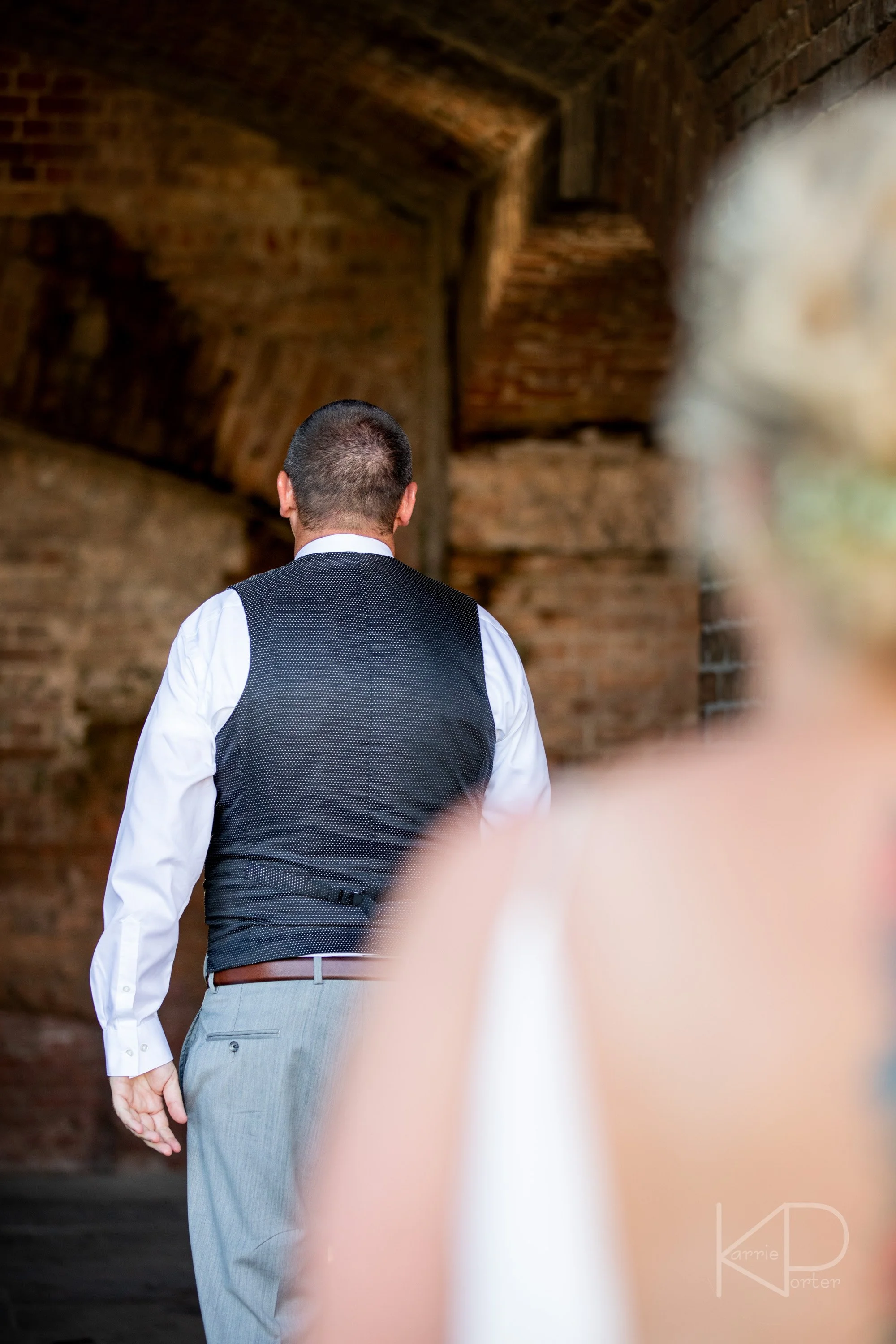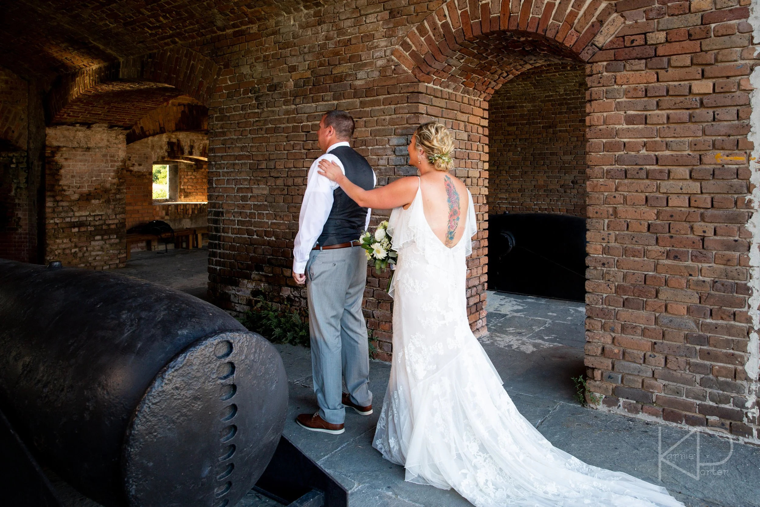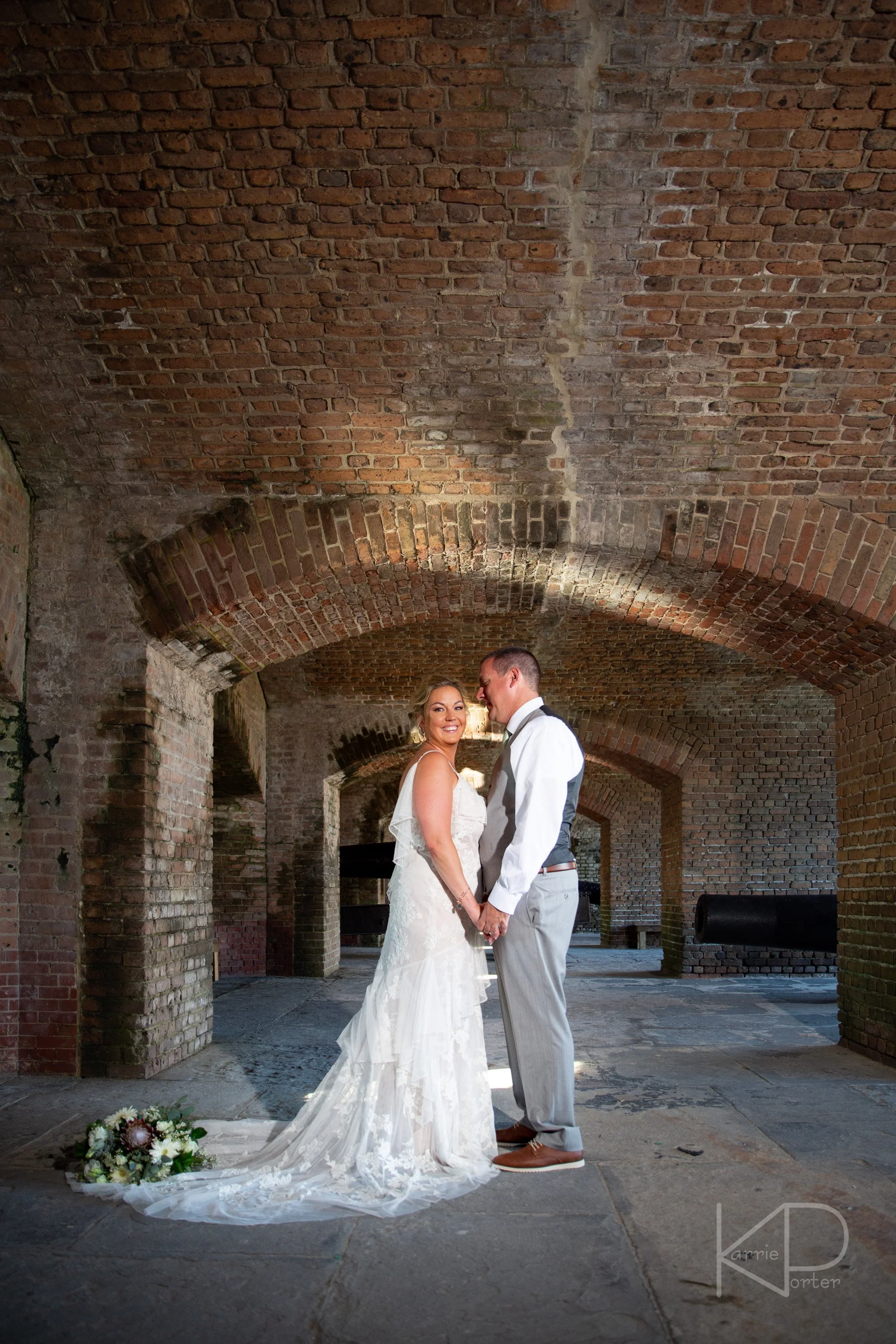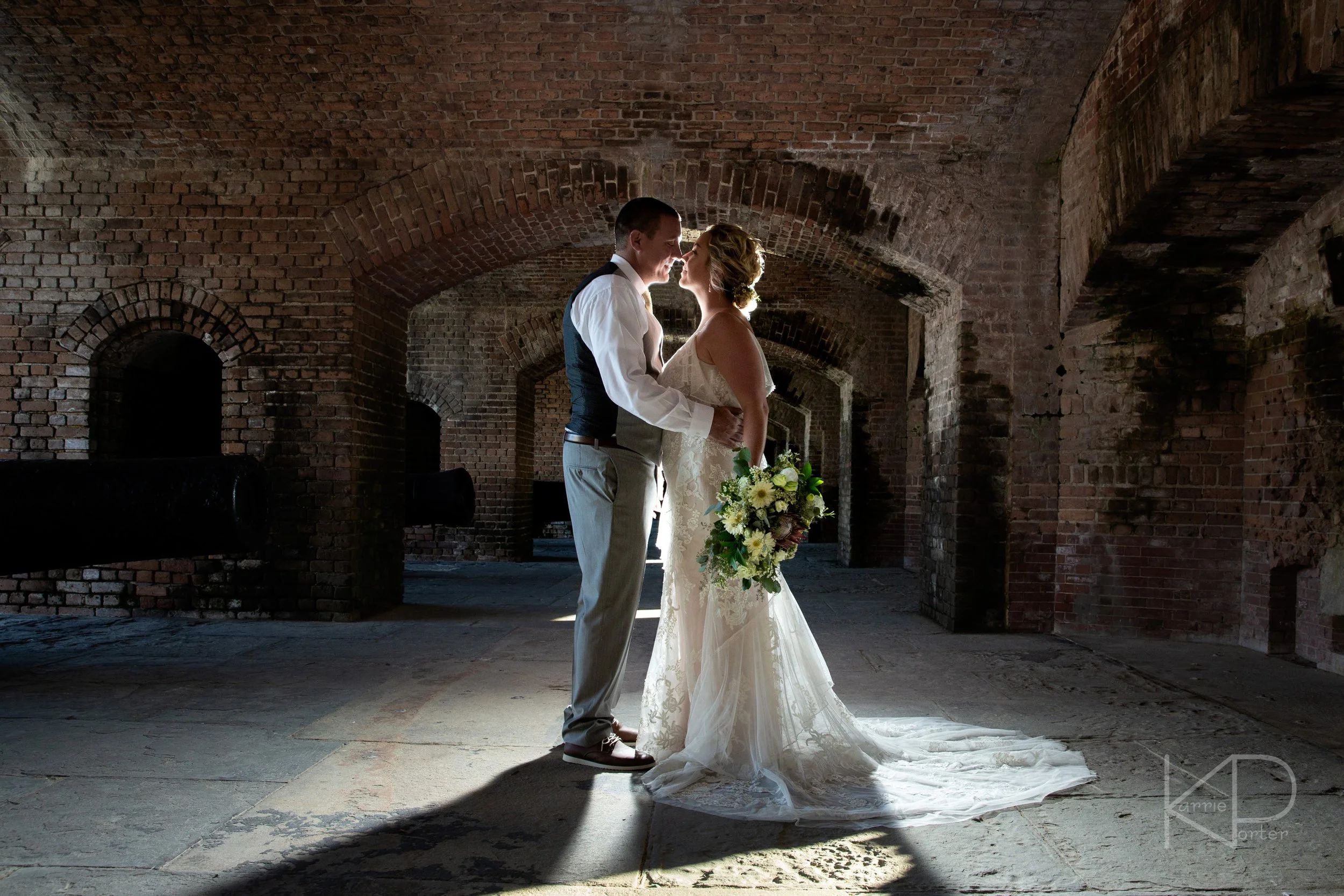 My day with them would begin in the historic location of Fort Zachary Taylor. As Eric waited patiently under the brick arches, Taralynn approached from across the lush green lawn looking picture perfect in her Watters designed gown. She snuck up behind Eric, and after a quick tap on the shoulder, he turned around to see her smiling back at him, as they enjoyed their first few moments together before the rest of the day got started.