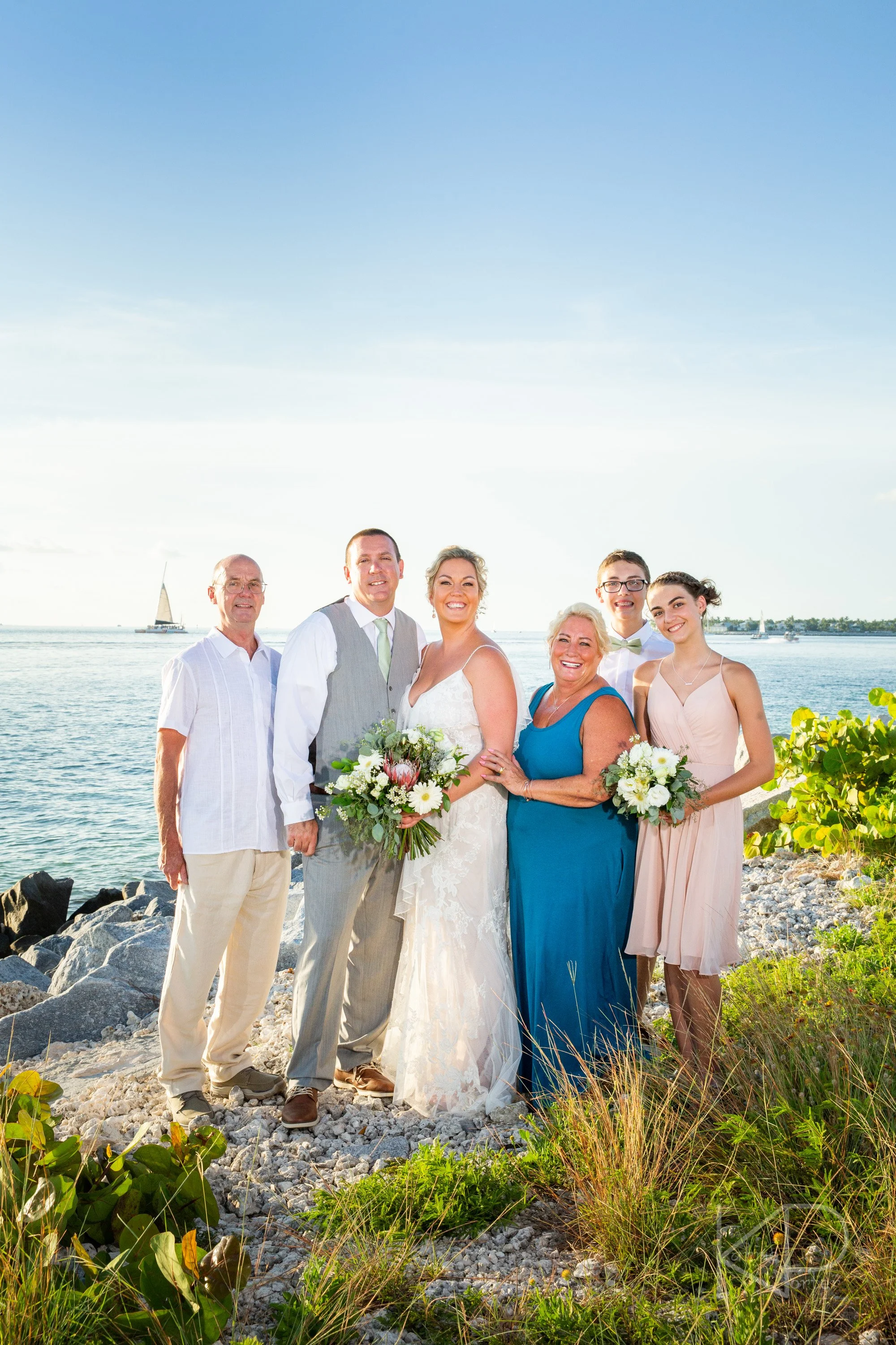 As we headed toward the ceremony spot, we took a quick stop off to meet up with family to get some group portraits, with the big blue water and sky of the Key West Harbour shining in the background.